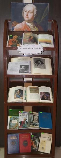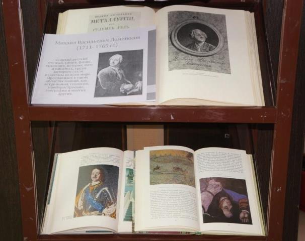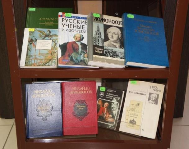 На выставке представлены книги о жизненном пути и деятельности М.В. Ломоносова, его произведения: избранная проза, поэзия, лирика.