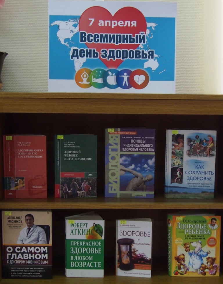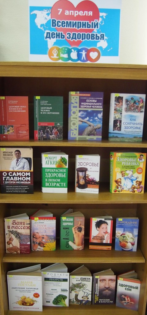 В преддверии Всемирного дня здоровья для читателей была оформлена книжная выставка-рекомендация «Формула здоровья». Из книг, представленных на выставке вы узнаете, что такое здоровье и как его сохранить. Здесь вы найдете издания о здоровом питании, о пользе движения и комплексах оздоровительных упражнений, о массаже, как средстве профилактики заболеваний, о том, как противостоять стрессам, секретах долголетия и др. Так, книга А. Л. Мясникова « О самом главном с доктором Мясниковым» полностью посвящена решению проблем со здоровьем обычного человека и дает взвешенные и откровенные ответы врача на все наиболее частые вопросы возникающие у людей о здоровье, в книге «Как сохранить здоровье» Р. Уиллиса в увлекательной форме излагаются причины, симптомы и способы избавления от самых различных заболеваний. А книга известного детского врача Е. О. Комаровского даст ответы на вопросы о том, что такое хорошо и что такое плохо для здоровья ребенка, рекомендации, позволяющие принять правильные решения.