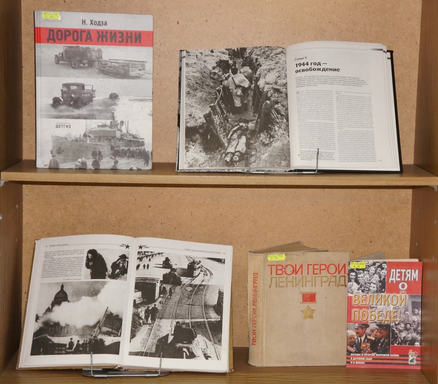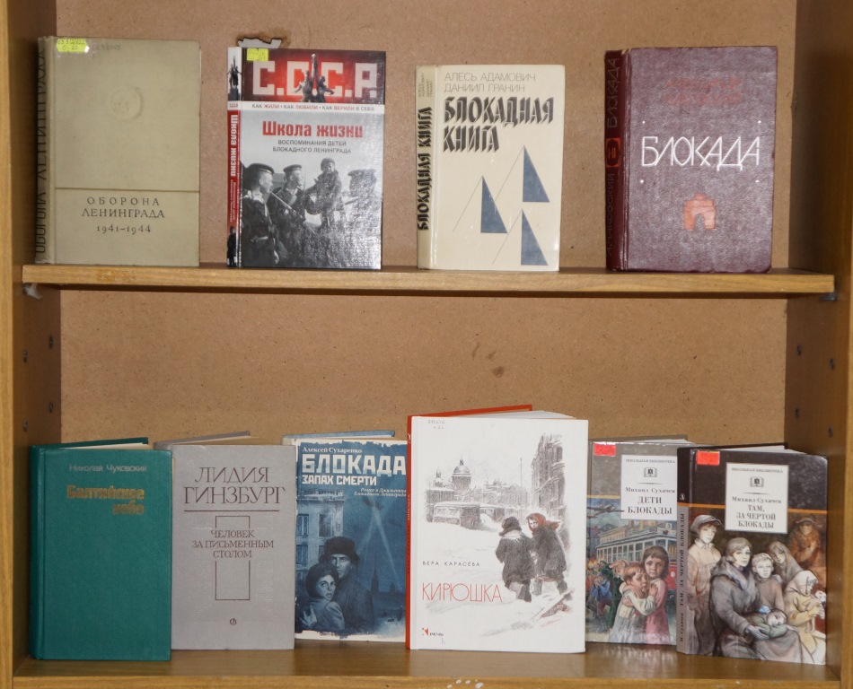 Из материалов выставки, вы узнаете о страшных днях блокады Ленинграда, о несгибаемой силе духа и вере в жизнь людей, оказавшихся в суровых условиях. На выставке представлена литература, не только отображающая хронику событий блокадного Ленинграда, но и художественные произведения в которых нашла отражение эта тема. Многие из авторов этих книг сами были свидетелями тех страшных дней, например, Михаил Павлович Сухачев, автор книг «Дети блокады», «Там, за чертой блокады» двенадцатилетним мальчиком пережил много месяцев в трагической и героической блокаде Ленинграда. Эти книги не просто литературное произведение, они рассказывают о тяжелых и страшных воспоминаниях, о борьбе ленинградцев и их детей, оставшихся в городе, об их невыносимых страданиях от голода и холода.