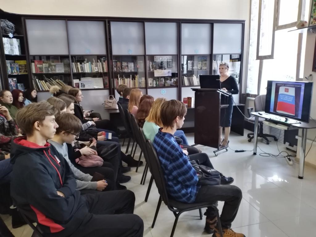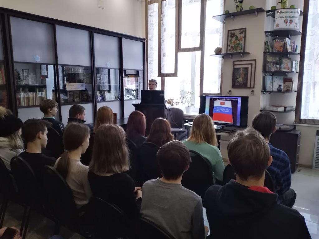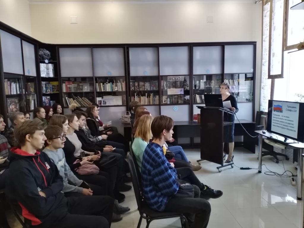 Гражданско-правовой час «Знание конституционных прав – твоя СИЛА и ЗАЩИТА» для студентов МГСТ прошел в Центральной городской библиотеке 19 декабря 2019 года. Разговор шел о важном для каждого гражданина РФ документе – Конституции страны, о важности соблюдения законов государства, о правах и обязанностях. Слушатели активно участвовали в викторине «Знаете ли вы Конституцию РФ».