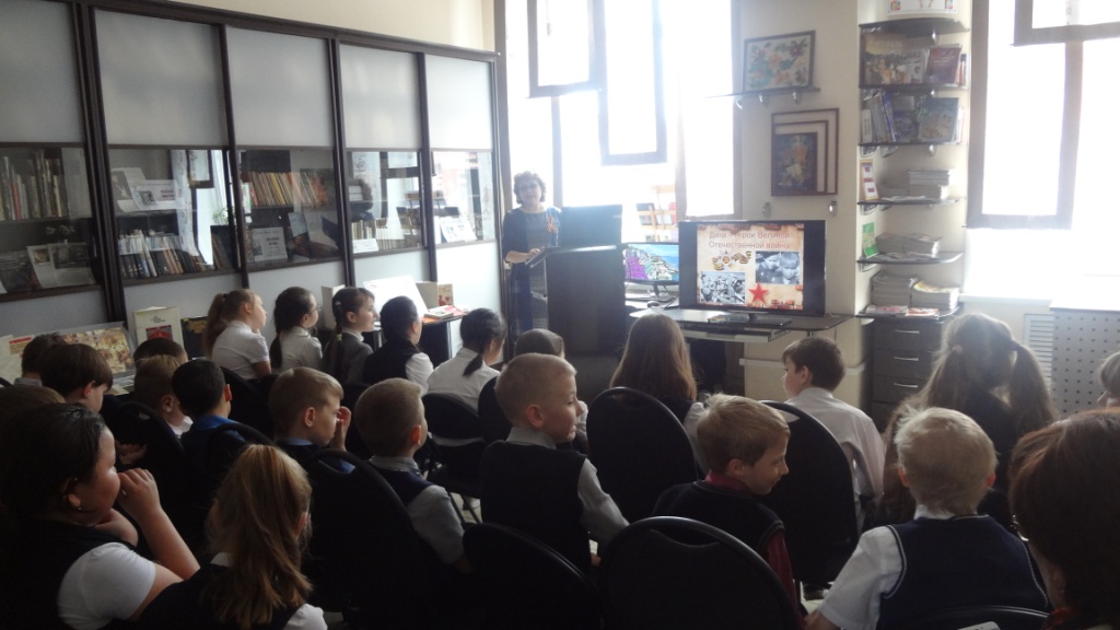 Для учащихся МОУ №2 был проведён урок мужества «Дети военной поры». Библиотекарь Арзамаскина И.В. рассказала о детях-героях, на чьи хрупкие плечи легла тяжесть невзгод, бедствий, горя военных лет. Очень важным было то, что младшие школьники с гордостью делились тем, что их прабабушки и прадедушки воевали на фронтах Великой Отечественной, и некоторые из них вернулись домой живыми!