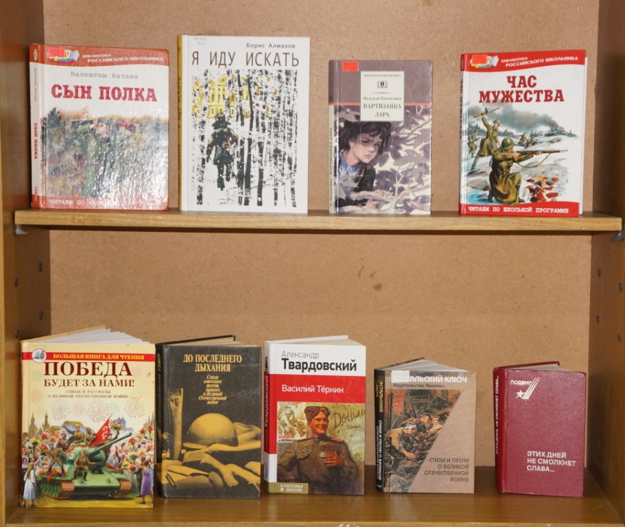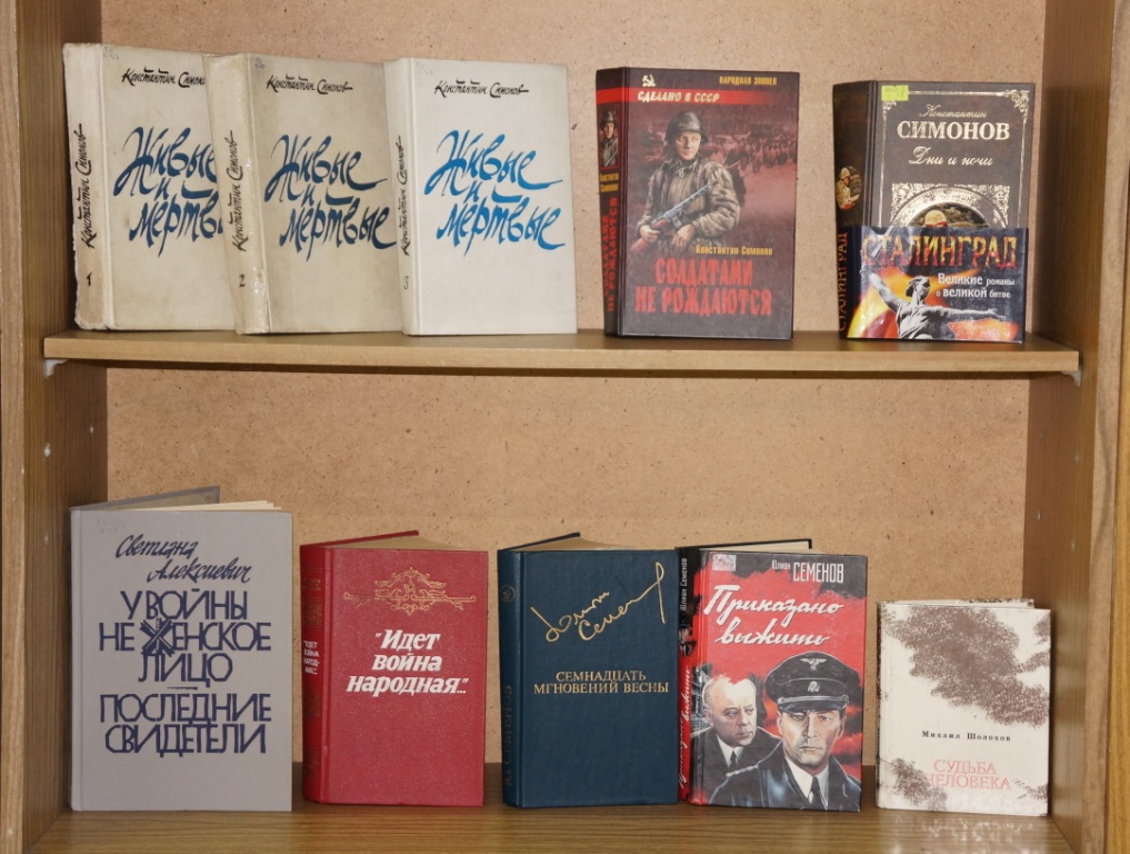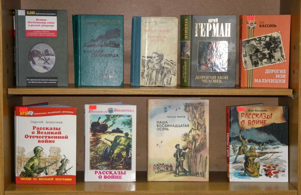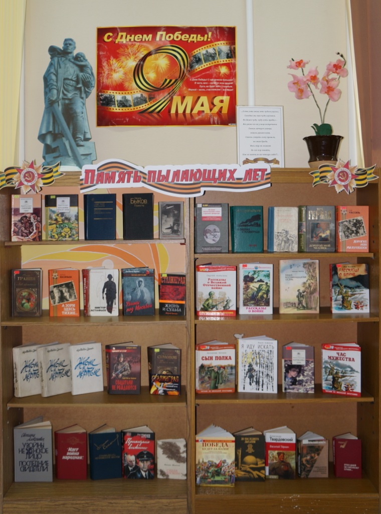 К этой знаменательной дате, библиотекарями Центральной городской библиотеки подготовлена выставка «Память пылающих лет». Великие сражения и судьбы обычных героев описаны во многих художественных произведениях, но есть книги, мимо которых нельзя пройти и о которых нельзя забывать, это «А зори здесь тихие…» и «В списках не значился» Б. Васильева, «Живые и мёртвые» К. Симонова, «Горячий снег» Ю. Бондарева, «Дожить до рассвета» В. Быкова и многие другие. Кроме того, на выставке представлены повести и рассказы о войне предназначенные для юных читателей, это «Сын полка» В. Катаева, «Рассказы о войне» Л. Кассиля, «Наша восемнадцатая осень» Н. Внукова и др. Они заставляют читателя задуматься о настоящем и прошлом, о жизни и смерти, о мире и войне.