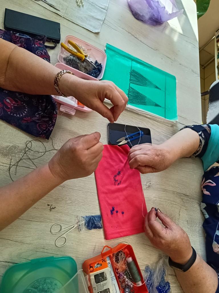 На этот раз рукодельницы похвастались своими домашними работами, которые они успели сотворить за минувшую неделю, среди которых ожерелья, снуды и повязки на голову. После, мастерицы провели мастер-класс по плетению ожерелья из бисера.