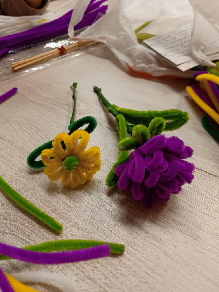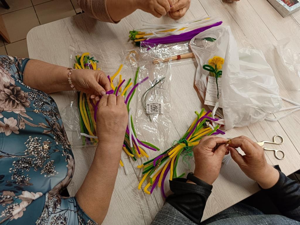 Не смотря на пасмурную погоду за окном, в руках наших рукодельниц распускаются настоящие букеты. Только они не совсем обычные, а созданы из синельной проволоки. Из податливого материала родились соцветия, которые в свою очередь сложились в яркие букеты. Рукодельницы узнали особенности работы с синельной проволокой, а также обсудили планы на ближайшие мастер-классы.