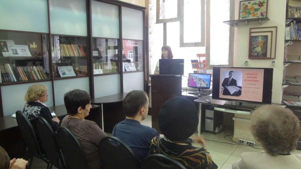 «Память сердца» – музыкальное путешествие по военным песням Никиты Богословского и Матвея Блантера к юбилеям композиторов. Библиотекарь Колесникова Н.Н. познакомила присутствующих с судьбой великих композиторов, уделив особое внимание песням о войне. Никита Богословский – классик советской песни, автор более 300 песен, оставивший в наследство песни, которые пели, поют и будут петь. Это человек, которым восхищались, которому завидовали; он позволял себе всё, что хотел, брал от жизни всё, что хотел, одним словом, был хозяином и режиссёром собственной судьбы. Матвей Блантер — крупнейший советский композитор-песенник, является автором более чем 2 000 песен! Музыка Блантера вошла в золотой фонд советской культуры. Мелодиям композитора свойственны лиричность, мелодическая яркость и простота, сердечность, близость интонациям русской народной песни и городского фольклора. Его песни исполняли: Леонид Утёсов, Сергей Лемешев, Иосиф Кобзон, Лидия Русланова, Марк Бернес, Леонид Харитонов, Булат Окуджава и др.