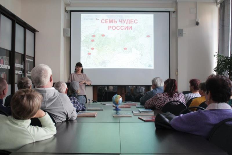 На мероприятии гости познакомились с историческими, культурными и природными чудесами современной России. По канатной дороге члены клуба поднялись на высочайшую гору Эльбрус, попали в таинственную Долину гейзеров, полюбовались самым глубоким и древнейшим озером Байкал, а на плато Мань-Пупу-Нер послушали, как гудят между собой великаны, превращенные в Столбы выветривания. Еще в коллекцию семи чудес добавили Собор Василия Блаженного, Петергоф и скульптуру «Родина-мать зовет!».