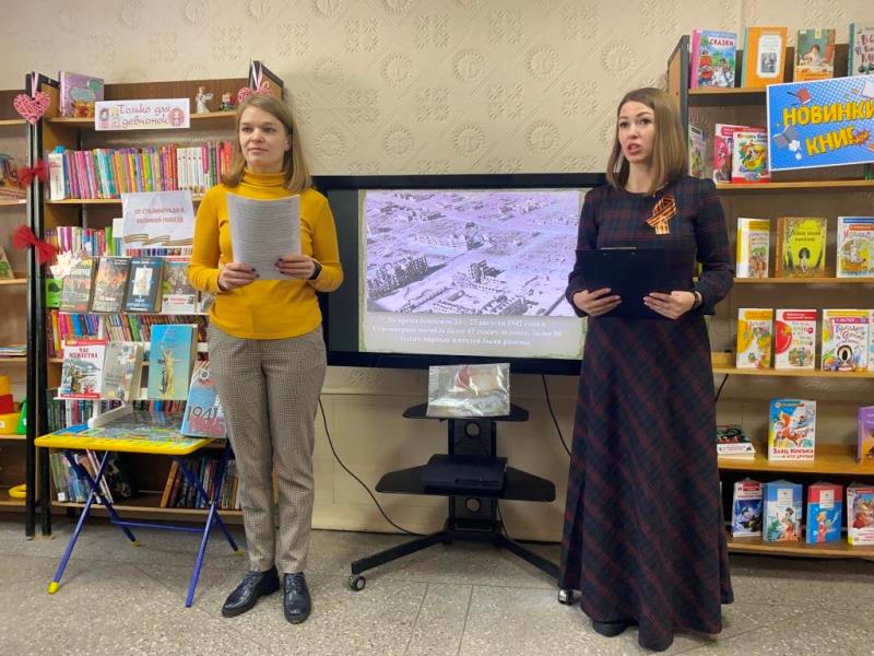 Победой Красной Армии 2 февраля 1943 года завершилось самое грандиозное сражение в истории Великой Отечественной войны – Сталинградская битва, которая началась 17 июля 1942 года. При помощи мультимедийной презентации участники мероприятия погрузились в далекое военное время, вспомнили о героизме и мужестве солдат, командиров, медсестёр. Библиотекари рассказали об основных этапах битвы, о мемориальном комплексе на Мамаевом кургане, воздвигнутом в честь защитников Сталинграда.