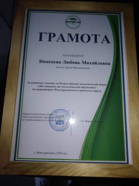Члены клуба поздравили Ивакаеву Любовь Михайловну, участницу конкурса «Экология. Семья. Культура», с награждением Почетной Грамотой за активное участие во Всероссийской экологической акции «Дня защиты от экологической опасности» на территории Междуреченского городского округа.