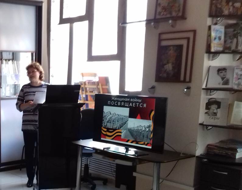 Библиотекарь Арзамаскина Ирина Владимировна с помощью презентации рассказала ветеранам о роли женщин на войне, об их подвиге на поле боя и в тылу. Напомнила о героической и трагической судьбе Зои Космодемьянской, Веры Волошиной, Алии Молдагуловой, Маншук Маметовой, Людмилы Павличенко, Юлии Друниной, Ольги Берггольц. Вспоминали о военной юности Элины Быстрицкой, о концертах Лидии Руслановой и Клавдии Шульженко для бойцов Красной армии. Участницы клуба читали стихи о войне, пели песни и частушки. Почтили минутой молчания память о не вернувшихся героях Великой Отечественной…