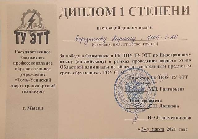 Лингвистический клуб «Discover English at the Library» посещают талантливые и трудолюбивые ребята, которые достигают высоких результатов в различных сферах жизни. Рады сообщить о победе одного из участников клуба, Березникова Кирилла, в Олимпиаде ГБ ПОУ ТУ ЭТТ по английскому языку.