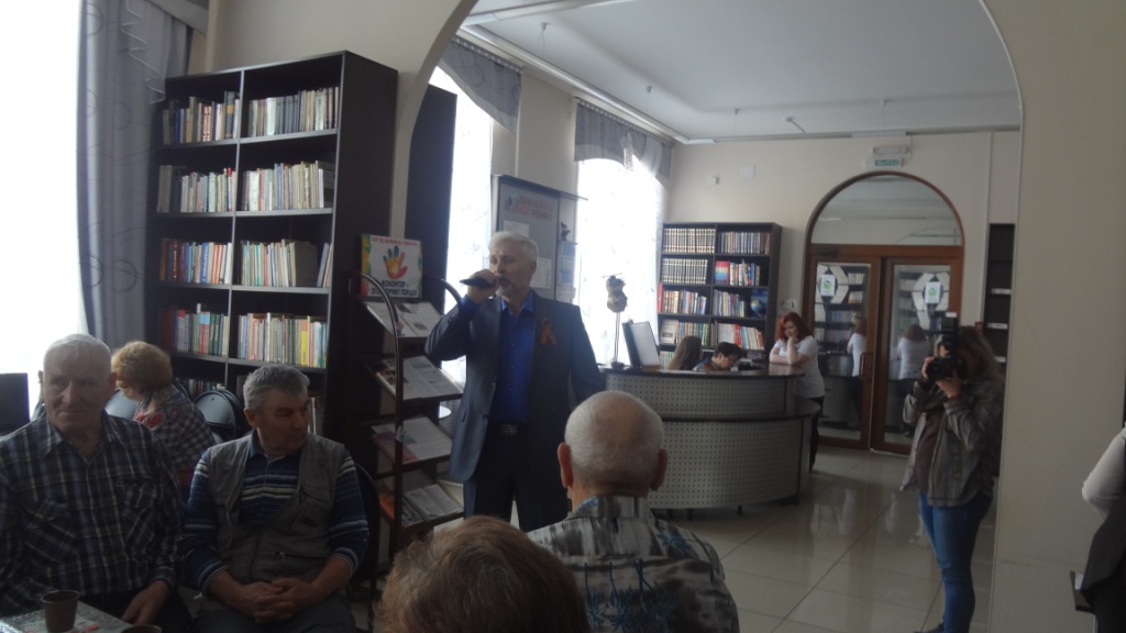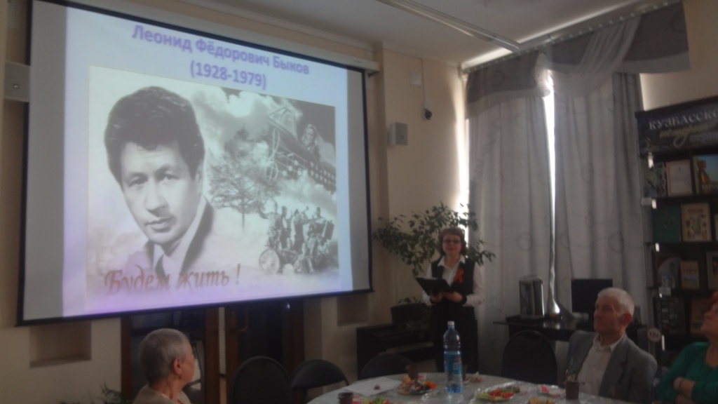 Библиотекарь Арзамаскина И.В. рассказала ветеранам о жизни и творчестве одного из самых любимых советских актёров Леонида Быкова, который снял легендарные фильмы о войне «В бой идут одни старики» и «Аты-баты шли солдаты». Участники клуба читали стихи и пели песни о войне. На встрече присутствовали корреспонденты газеты «Знамя шахтёра в новом тысячелетии».