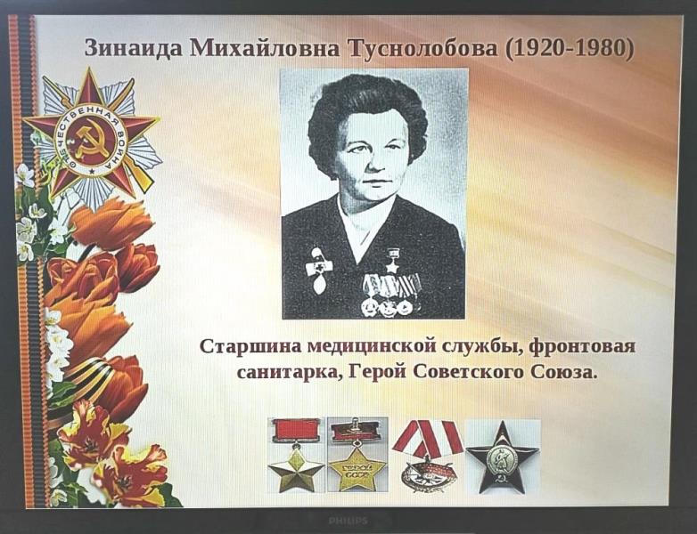 Женщина и война... Оба эти слова женского рода, но как же они несовместимы... Библиотекари рассказали о жизни и героическом подвиге наших землячек в годы Великой Отечественной войны. Ветераны познакомились с бессмертным подвигом Веры Волошиной, который она совершила в далеком 41-ом, а звание Героя России ей было присвоено только в 1994 году. Долгие годы её подвиг был неизвестен, но благодаря поисковым мероприятиям имя Веры Волошиной навеки вписано в героические страницы Кузбасса и России. Присутствующие узнали, что советский военный врач, медик, участница Великой Отечественной войны, Герой Советского Союза старшина медицинской службы Зинаида Туснолобова за восемь месяцев пребывания на фронте вынесла с поля боя 123 раненых! Её называют женщиной-легендой, дочерью Родины, сверхчеловеком. В 22 года она потеряла на войне руки и ноги. Другой бы умер от отчаяния, или попал в интернат для инвалидов. А она заставила судьбу работать на себя... В ходе встречи использовались слайды с фотографиями и видеофрагменты из документальных фильмов «Обратный отсчёт» и «Санинструктор Зина».