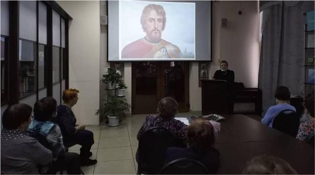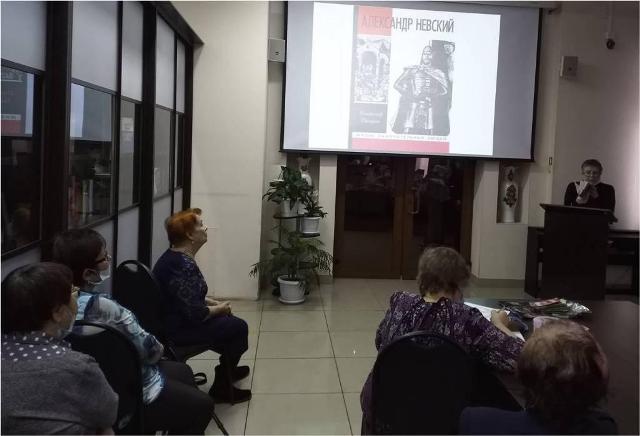 Во время историко-патриотического часа «Александр Невский – великое имя России» члены клуба «Вдохновение» совершили путешествие в мир истории Руси. Состоялось их знакомство с жизнью и подвигами выдающего полководца, дипломата и святого князя земли русской. Чтобы ярче представить образ князя Александра Невского слушатели познакомились с художественными произведениями русских писателей и сами по отрывкам читали поэму Константина Симонова «Ледовое побоище». Сильное впечатление произвёл и фильм Эйзенштейна «Александр Невский», фрагменты которого участники встречи посмотрели и обсудили. Участники клуба ознакомились с книжной выставкой «Солнце земли русской», подготовленной библиотекой.