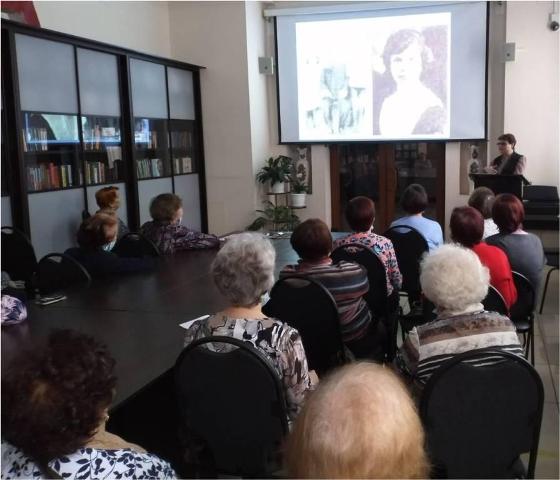 «Муза в солдатской шинели» – так называлась литературно-музыкальная композиция к 115-летию со дня рождения Клавдии Ивановны Шульженко, во время которой ветераны познакомились с жизнью и творчеством певицы. В военные годы Шульженко дала сотни концертов на фронтах Великой Отечественной. Её высокий, хрустально-серебряный, удивительно пронзительный голос узнавали с первой ноты. Когда в её исполнении звучала песня «Синий платочек», все зрители не могли сдержать слёз, даже самые смелые и мужественные фронтовики, за плечами которых километры пройденных военных дорог. Эта песня живёт уже много десятилетий, она не раз звучала в другом исполнении, но такого невероятного, запредельного проникновения в душу удалось добиться только ей – Великой певице. Её звали «советская Эдит Пиаф», и певица действительно была достойна такого сравнения. Демонстрировались отрывки из документальных фильмов с участием Клавдии Шульженко и звучали песни в её исполнении.