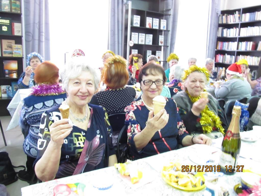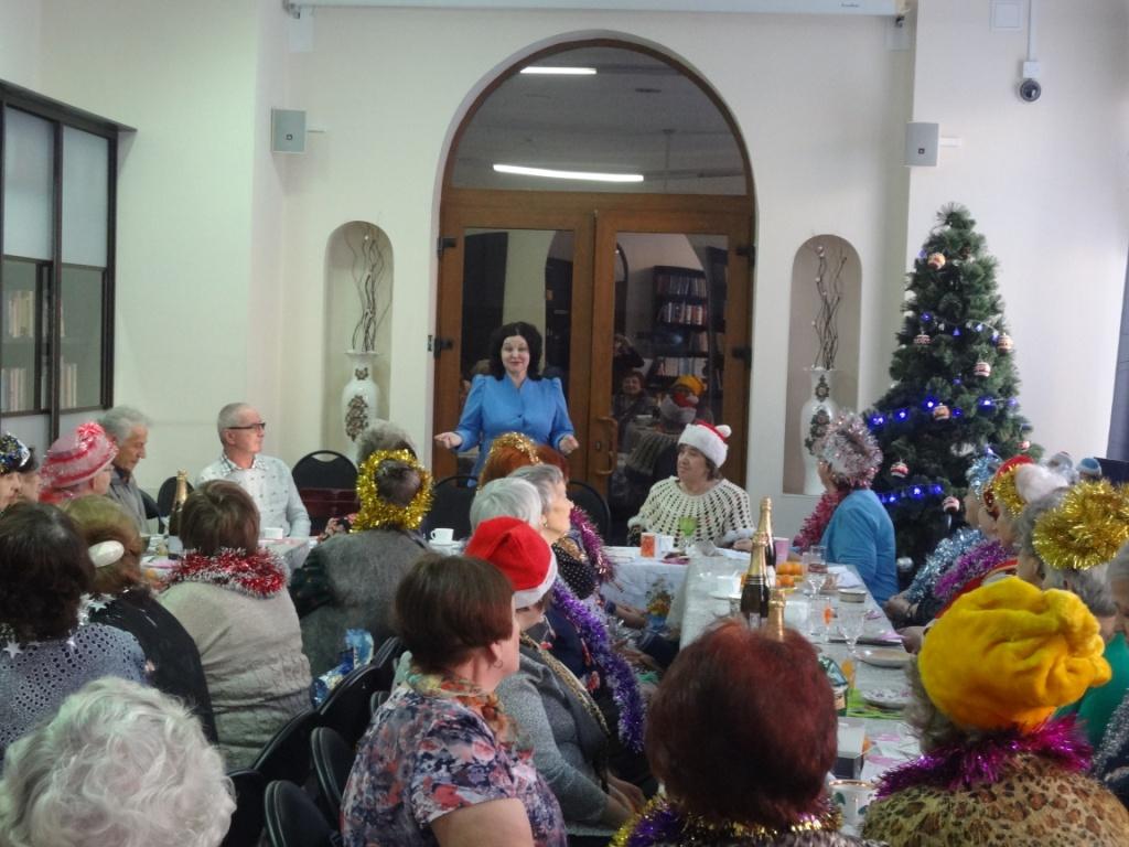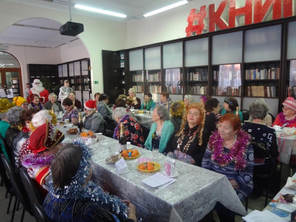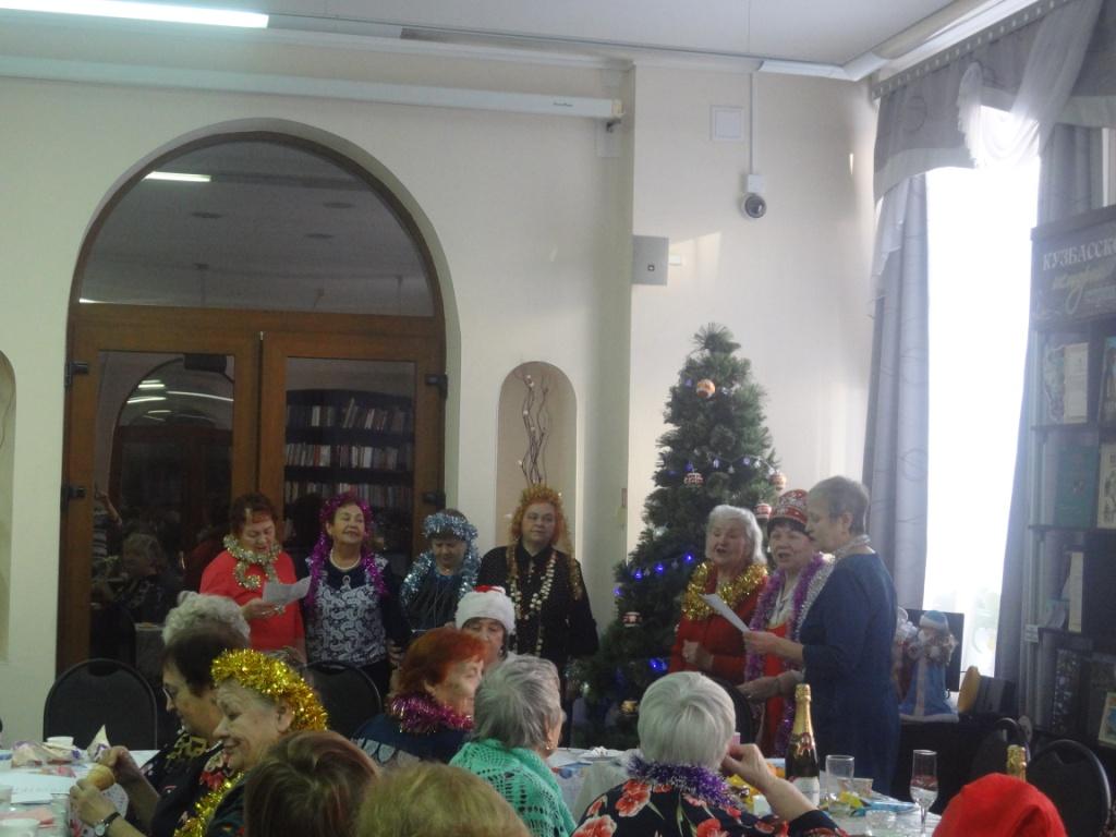 От лица библиотеки ветеранов поздравила директор МБУК «МИБС» Жукова Светлана Владимировна. Дед Мороз попросил исполнить для него новогодние песни «Маленькой ёлочке», «Кабы не было зимы», «У леса на опушке». А Снегурочка провела свою игру-викторину. Под музыкальное сопровождение Ефима Семёновича Ройза звучали песни «Ах ты, зимушка-зима», «Новогодний вальс», «Белым снегом» и другие. Ведущие встречи провели игру «Что впереди?», тост-игру с пожеланиями. Активисты клуба познакомили с предсказаниями по знакам зодиака, спели «В лесу родилась ёлочка на новый лад», разделившись на команды «Малость пьющие» и «Малость непьющие». Команда «Подсмаженко и Ко» представила свои шуточные развлечения. После игры-кричалки про мороженое руководитель клуба Фаина Егоровна Рехова угостила всех настоящим мороженым! Людмила Николаевна Черепанова организовала сказку «Репка на новый лад», раздав роли всем желающим. Праздник получился очень добрым, позитивным и насыщенным на шутки, веселье и смех!!!