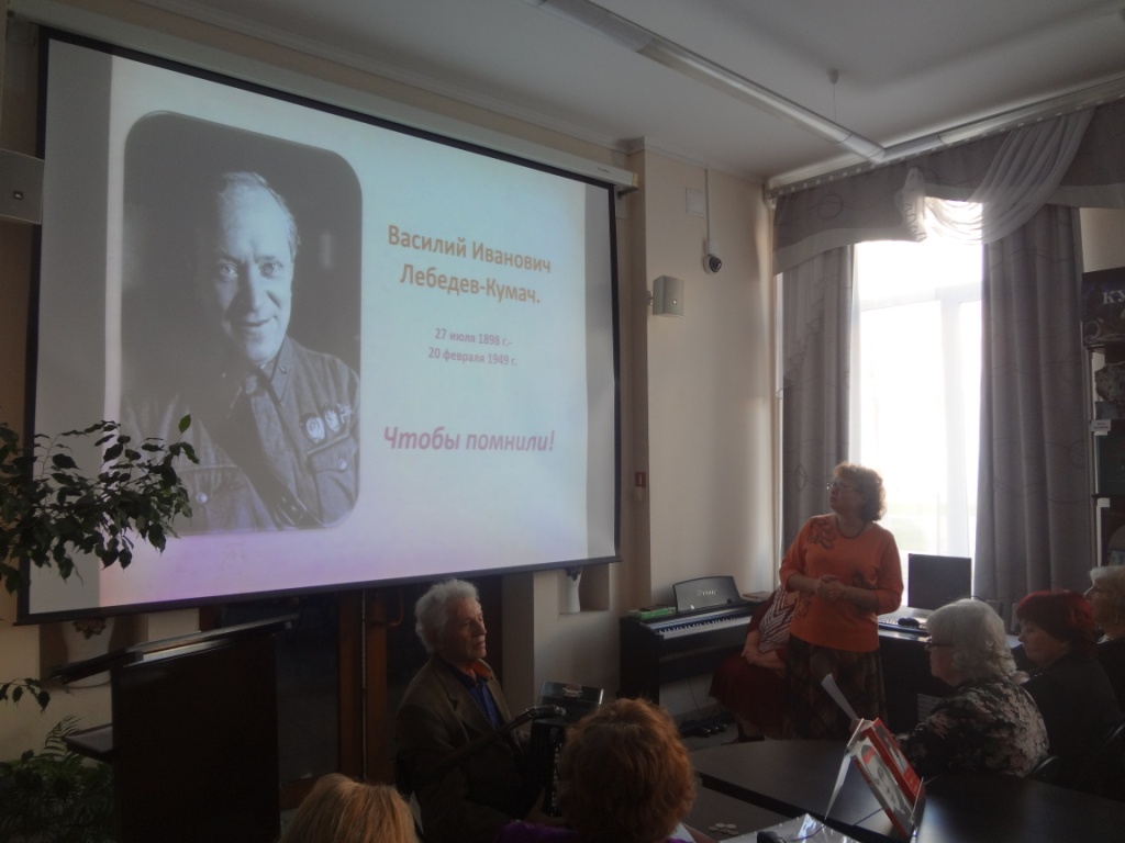 18 октября в Центральной городской библиотеке состоялось очередное заседание литературно-музыкального клуба «Вдохновение» городского совета ветеранов, посвящённое 75-летию оперной певицы Тамары Синявской и 120-летию со дня рождения поэта-песенника Василия Лебедева-Кумача.