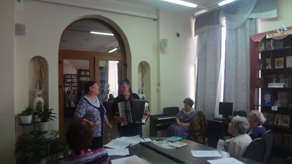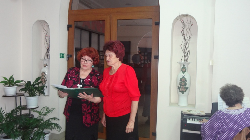 Встреча началась с концертной программы вокального дуэта под руководством Триноженко Ольги Михайловны. Потом все вместе исполняли любимые песни о войне, читали стихи. Кира Григорьевна Боровикова поделилась впечатлениями о поездке в Санкт-Петербург на День Победы, их, как блокадников, чествовали в этом славном городе-герое.