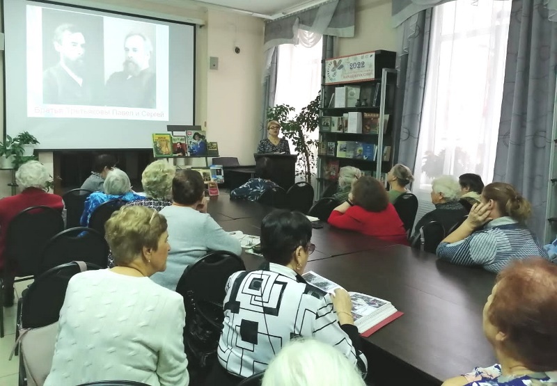 Виртуальная экскурсия «Первый русский продюсер» познакомила присутствующих с жизнью основателя Третьяковской галереи Павла Третьякова. Павел Третьяков – известный российский предприниматель, коллекционер, меценат. Этот мудрый, дальновидный и основательный человек был рядовым любителем искусства, но за годы жизни стал величайшим знатоком живописи, который с первого взгляда отличал суррогат от истинно художественных произведений. Более 40 лет Павел Третьяков коллекционировал картины. Благодаря его поддержке творили маститые художники и те, кто только начал осваивать азы живописи. Он собрал одну из крупнейших коллекций русской живописи и целую галерею прижизненных портретов своих выдающихся современников. До конца жизни Павел Третьяков оставался попечителем галереи, покупал для неё картины, работал над каталогами. Была оформлена книжная выставка с репродукциями картин Третьяковской галереи и с книгами о жизни и деятельности П.Н. Третьякова.