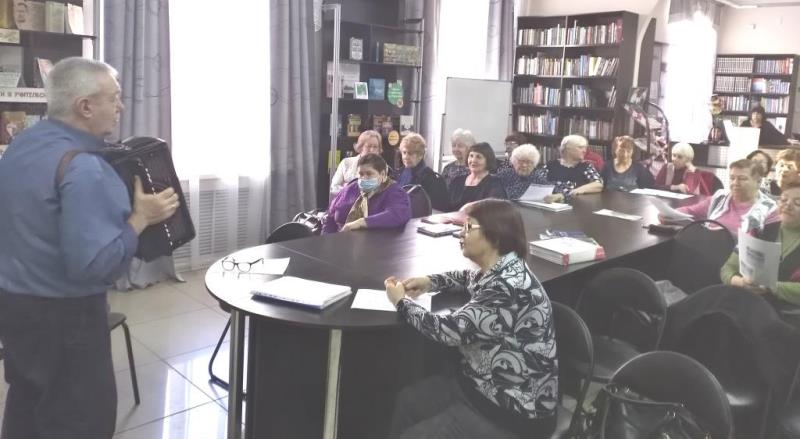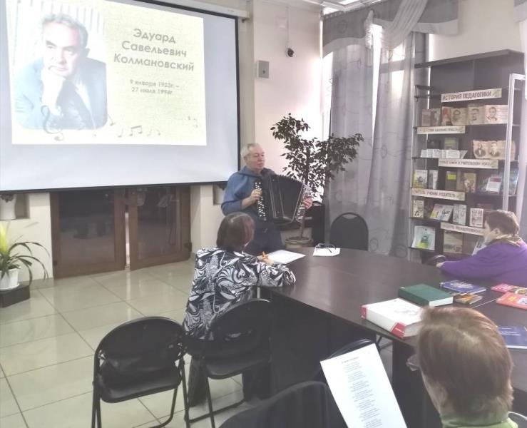 Закончилось мероприятие музыкальным калейдоскопом к 100-летию композитора Эдуарда Колмановского «Споёмьте, друзья!». Библиотекарь знакомила с историей создания песен композитора. Под аккомпанемент Войткевича Марка Ивановича ветераны пели эти песни: «Я люблю тебя, жизнь!», «Хотят ли русские войны?», «Алёша», «Вальс о вальсе», «Песенка без конца», «Я работаю волшебником», «Таёжный вальс», «Люди в белых халатах», «Мы выбираем, нас выбирают…» и другие.