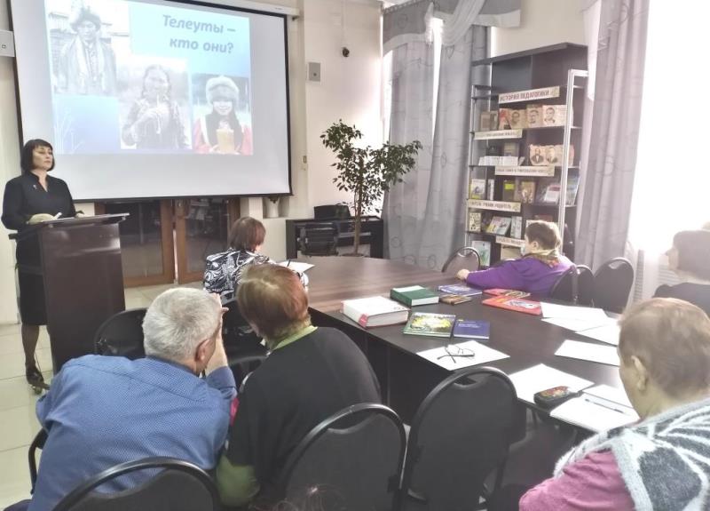 Вначале для ветеранов провели этнографический обзор «Коренные народы Кузбасса» к 80-летию Кемеровской области. Коренные народы проживают во всех частях света. Красота и уникальность малых этнических групп, их языки и традиции без сомнения вносят разнообразие в мировую культуру. Члены клуба узнали, что в пределах Кузбасса можно выделить три малочисленных коренных народности: шорцы, телеуты и кумандинцы, но последние не внесены, согласно постановлению правительства, в единый перечень коренных малочисленных народов РФ. Тем не менее кумандинцы, или как они себя называют люди-лебеди, обладают уникальной историей и интересными традициями. Шорцы, телеуты и кумандинцы имеют тюрские корни, поэтому у них много общего. Присутствующие познакомились с историей происхождения малочисленных коренных народов, с их обычаями, религиозными верованиями, языком и фольклором.