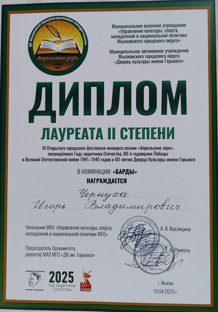 19 апреля в г. Мыски во Дворце культуры имени Горького прошел III Открытый городской фестиваль-конкурс поэзии «Апрельские зори – 2025».