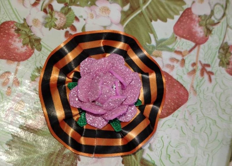 Для изготовления броши нам понадобились: георгиевская лента, глитерный фоамиран, ножницы, горячий пистолет и наша фантазия!