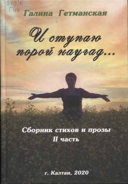 1Гетманская, Галина Васильевна. И ступаю порой наугад... : сборник стихов и прозы, 2 часть / Галина Васильевна Гетманская, Поэтический клуб «Родник» г. Калтан, Литературный Южно-Кузбасский Союз «ЛЮКС» г. Новокузнецк . – Калтан : без издательства-Калтан, 2020 . – 197 с. : в переплете ; 22 см . – 200 экз. – 16+ .