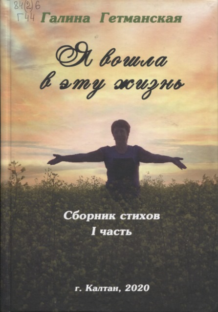 1Гетманская, Галина Васильевна. Я вошла в эту жизнь : сборник стихов, 1 часть / Галина Васильевна Гетманская, Поэтический клуб «Родник» г. Калтан, Литературный Южно-Кузбасский Союз «ЛЮКС» г. Новокузнецк . – Калтан : без издательства-Калтан, 2020 . – 239 с. : в переплете ; 22 см . – 200 экз. – 16+ .