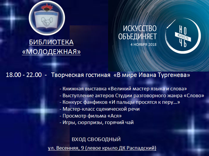 Библиотека «Молодежная» приглашает всех желающих 4 ноября с 18.00 до 22.00 окунуться в мир Ивана Тургенева – великого русского писателя, 200-летие которого отмечается в этом году в России. Вы узнаете много интересного о писателе, услышите произведения Ивана Сергеевича в исполнении молодых актеров Студии разговорного жанра «Слово», романсы на стихи Тургенева, примите участие в увлекательных литературных играх, проявите свои творческие способности в конкурсе фантиков «И пальцы просятся к перу...».